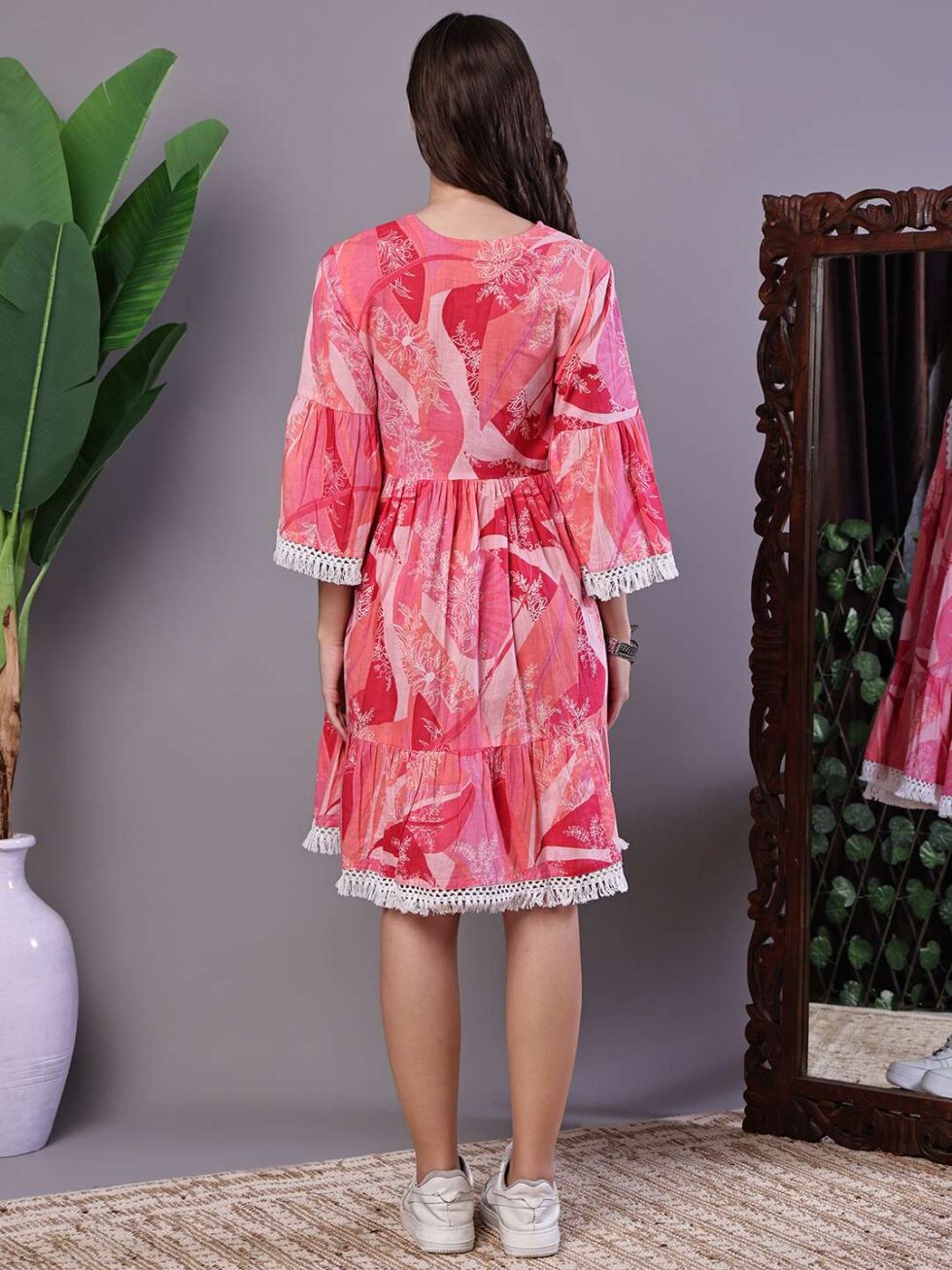 This stylish, tiered tunic mini-dress offers a beautiful flared silhouette with a playful, movement-filled skirt. It features an intricately detailed V-neckline with lace and threadwork, and is finished with a trendy fringe/tassel trim on the sleeves and hem. It’s a versatile and comfortable statement piece perfect for a modern bohemian look.